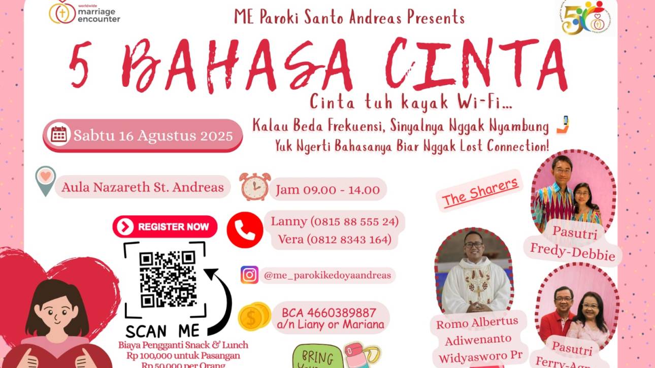 REKOLEKSI 5 BAHASA CINTA Sat Aug, 2025 @ 09:00 - 14:000Comments Komunitas Marriage Encounter St. Andreas mengundang kamu untuk ikut rekoleksi yang ringan tapi penuh makna : “Udah sayang, tapi kok dia gak ngerasa ya?” Mungkin bukan kurang cinta… Mungkin cuma beda bahasa ❤️ Yuk…Read More